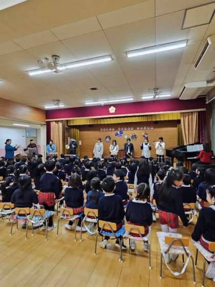 始業式では先生たちが「ゆめをかなえてドラえもん」の曲で合奏を披露しました。合奏が終わると「もう一回!もう一回!」という声が子どもたちからあがり、再び合奏を披露しました。3学期の生活が子どもたちにとって楽しいものになるようにと思います。