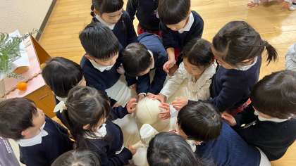 「園長先生のお話覚えてるよ!」と教えてもらったら由来を聞かせてくれました。「お餅のパワーをもらわないと!」とみんなお餅を囲んでいましたよ。すみれ組さんが今年も元気ににこにこで過ごせますようにとお願いもしました。