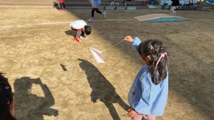 好きな遊びの中で、折り紙を使って凧揚げをしました。くるくるっと回ったり、風が吹くとゆらゆら飛んでいくのが楽しかったようです。影に映る凧もゆらゆら揺れる様子を見て「影の凧も同じだよ!一緒に動いてるよ!」と影が同じように動く姿が不思議だったみたいです。