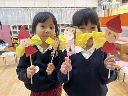お話遊びの経験を通して、日頃の遊びにも言葉のやりとりが増えてきています。いろいろな遊びを通して、成長を感じます。これからも、子どもたちから出てきた楽しい遊びを存分に楽しめるよう工夫していきたいと思います。