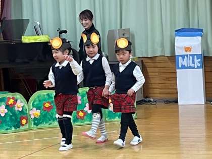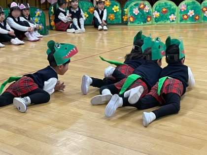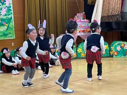 3歳児もも組劇遊び「ノンタンのたんじょうび」幼稚園で初めての発表会、お友達と一緒に動物さんになるのがとっても楽しそうでした。ないしょないしょノンタンにはないしょ…いったい何をしてるのかな?ニコニコ笑顔がいっぱいの子どもたちでした。