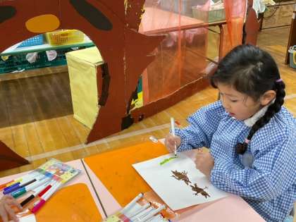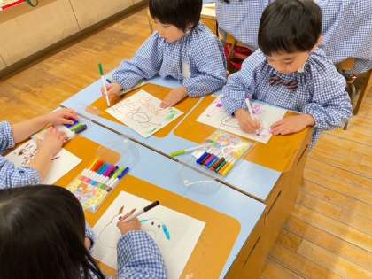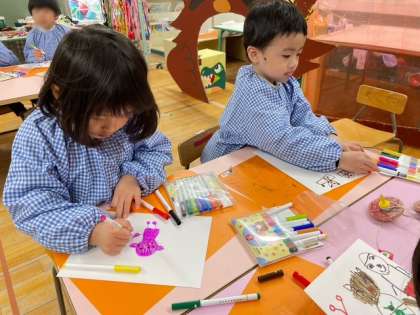 昨日発表会を終えたばら組さんは劇遊びの絵を描いていました。オオカミや子ヤギになってずっと遊んでいたので、クラスのみんなでお話の世界を存分に楽しんできました。絵をかくのもとっても楽しそうでした。