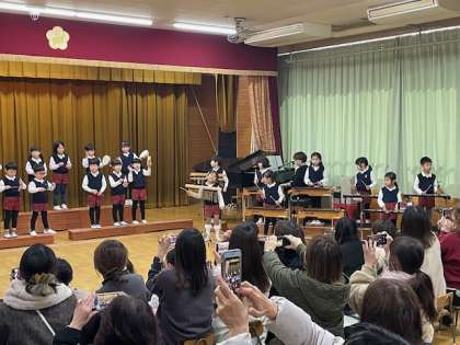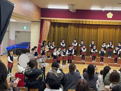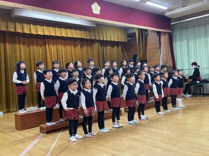 2クラス合同の歌と合奏、聞いていると心が震えました。子どもたちの素直で明るい気持ちが歌声にのり遊戯室いっぱいに響きわたりました。来月17日は保育修了式、みんなで一緒に過ごせるのもあとわずかです。進学する小学校が別々になっても、いつまでもお友達でいれますように。