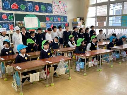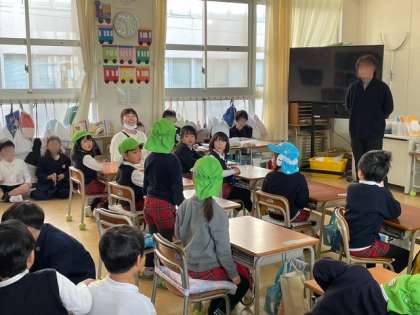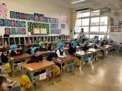 今年度の西船場小学校との交流も3回目、今回は1年生の教室に入らせてもらいました。椅子に座らせもらい机に向かいました…。初めての経験なのでドキドキしたり背筋がピンとのびたりしていました。