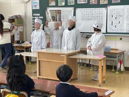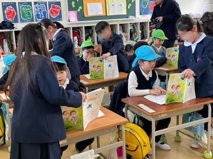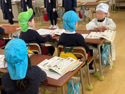 1年生の皆さんは、小学校の授業や給食のことなど、順に前に出て幼稚園の子どもたちの為に話してくれました。優しい1年生の皆さんのおかげで、うめ組ゆり組さんの少し緊張していた心がほぐれていきました。笑顔になりました。幼稚園とは違うたくさんのことを知り、4月からの新しい生活に期待をもったり、「紙版画、幼稚園でもしたね」「ヒヤシンス、幼稚園にもあるね」と同じことを見つけたりしていました。西船場小学校1年生の皆さんと先生方ありがとうございました。