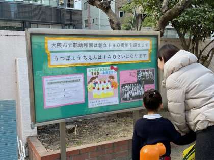 靱幼稚園は来年度140周年を迎えます。地域の皆様に支えていただき、私たちの大先輩である教職員の方々が子どもたちと向き合い保育をされてきて今に至っています。保護者の方々がお子さんの送り迎えをされ、子どもたちは集団生活での遊びを通して様々なことを学び小学校へと巣立っていく…毎年毎年繰り返され140年の歴史が重ねられてきたことを思うと感慨深いものを感じます。子どもたちや保護者の皆様に知っていただきたくて掲示物を作成したところ、早速見てくださってとても嬉しかったです。