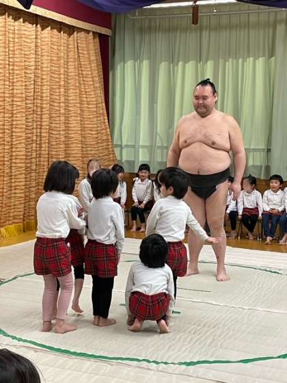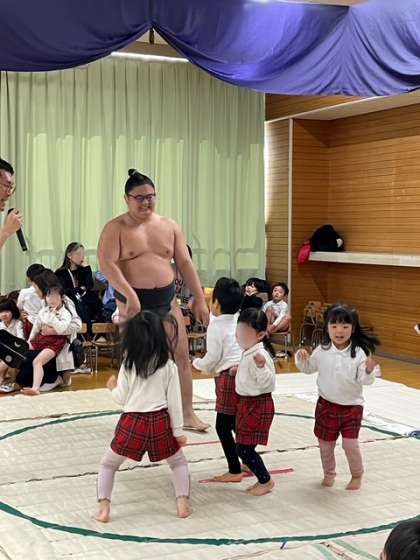 大きなおすもうさんにびっくり、 優しいおすもうさんにおすもうごっこをしてもらいました。