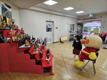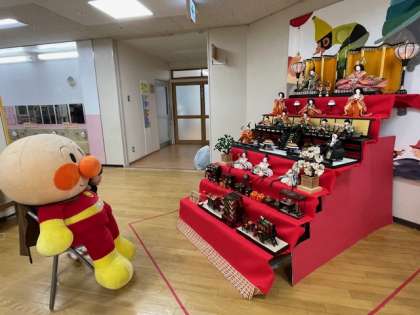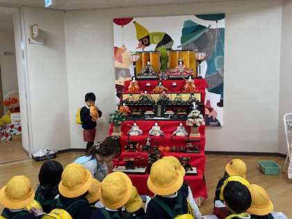 今日は3月3日ひな祭り、3月生まれの子どもたちのお誕生会を行いました。今年度のお誕生会もこれで終わりです。みんなひとつずつ大きくなり、4月に進級入学することを楽しみにしています。3歳児クラスの女の子、お雛さんがとっても大好きで毎日毎日お雛さんを見るために玄関ホールにやってきます。そして「せんせ、いっしょにみよう」と誘ってくれるのだそうです。誘われた先生は今日はたまたま急いで対応しないといけないことが他にできたので、「ちょっと待っててね、先生のかわりにアンパンマンを座らせておくから一緒に見ててね、お雛さんのことをおしえてあげてね」と声をかけたのだそうです。美しいもの、大切なもの、存分にその魅力を味わっている様子が伝わってきました。