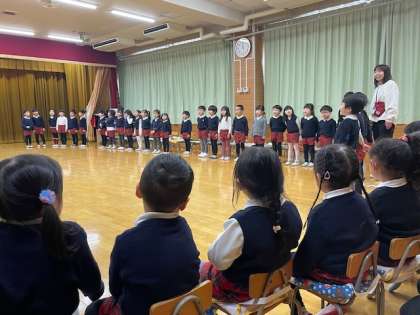 最後は年長さんの歌です。「ありがとう、こころをこめて」の曲、歌詞のひとことひとことに、気持ちがこめられて、聴いている年中年少の子どもたち、教職員に心にしっかり届きました。感動して胸が震えました。