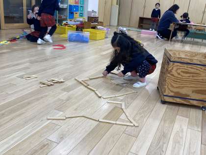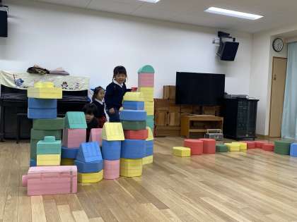 雨の日は子供たちが大好きなお外遊びに行けなくて。でも、お部屋の中でも楽しい遊びがいっぱい。お相撲大会を通して子供たち自ら相撲をとったり、多目的室では、保育室とは違った玩具に大喜び。大きいブロックを高く積み重ねて「お家だよ、いらっしゃい。」長く繋げて、ブロックの道を歩いている子。たくさんのカプラで遊ぶ子などなど。たんぽぽぐみのお友達と過ごすのもあと少しですが、皆で仲良く遊んでいます。