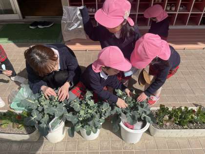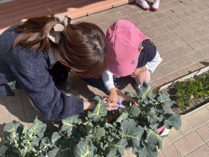 暖かくなったころから、だんだん大きなブロッコリーになり、「持って帰れるかなぁ」「どんな味かなぁ」とワクワクしていました。そしてついに、今日、みんなで収穫をしました。1人ずつに分けると少しずつになったけれど、とっても嬉しそうなもも組の子どもたちでした!