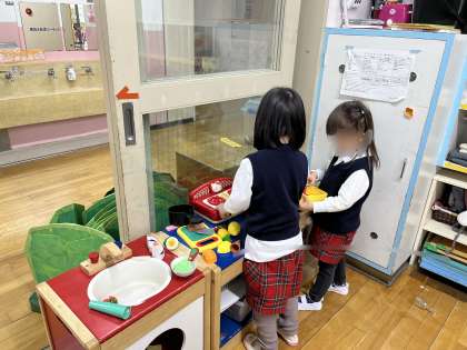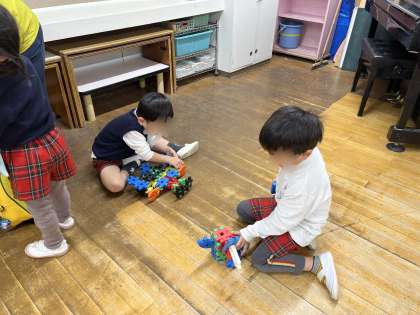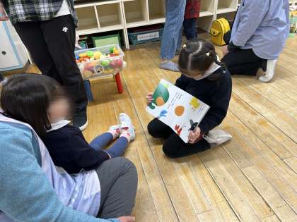 新入の3歳児さん、4歳児さんもいます。初めての幼稚園で不安で緊張している子もいましたが、在園児のお兄さん、お姉さんが優しく声をかけてあげたり、絵本を読んであげたりし、初めてのお友達も元気に遊ぶことができました。在園児の優しく頼もしい姿が見られ、成長を感じました。