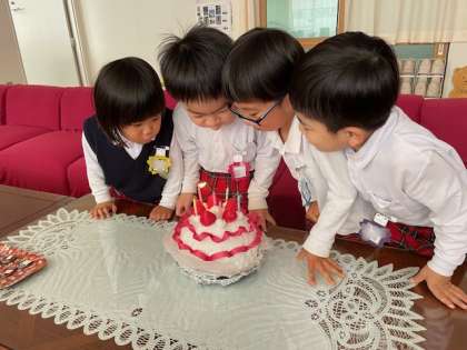 お誕生日会楽しみ 公開日 2025/04/21 更新日 2025/04/21 うつぼ日記 4月生まれの子どもたちが園長室にやってきました。明後日水曜日がお誕生日会、お祝いのバッジをつけてあげるとみんな大喜びしていました。手作りケーキのローソクに火をつけて、ふーと吹き消しました。お誕生日を迎えたことをたくさんの友達に祝ってもらう、成長の喜びを味わう素敵な時間にしたいです。 いいね(0)