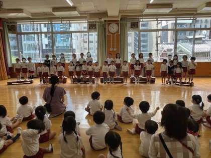 年長さんが歌を歌ってくれました。靱公園で行われるバラ園コンサートで歌う歌です。歌のお口は卵のお口、しっかり口をあけて