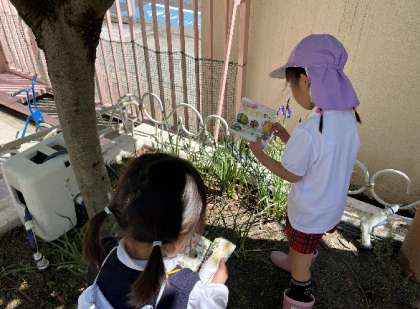 「あかいからこれかな?」「バラだね!」「こっちにはきいろがはいってるよ」と図鑑と本物のお花をよ〜く見比べていました。