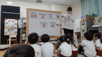 幼稚園での活動を元気に過ごせるよう、健康的な朝の生活習慣についての話をしました。