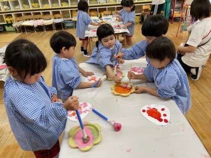 イチゴをつくろう! 公開日 2025/05/15 更新日 2025/05/15 うつぼ日記 3歳児たんぽぽ組のお部屋では、タンポに絵の具をつけてポンポンしています。何やらとっても楽しそう!先生が「イチゴをつくろう!」と誘いかけて活動を始めたそうです。幼稚園のお庭のイチゴが真っ赤になっています。明日は葉っぱをつけるそうですよ、楽しみですね。 いいね(0)