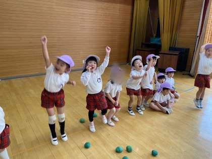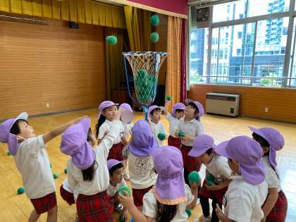 年中さん皆で一緒に、玉入れをしたり、フープをくっ付けてお友達と協力して、かけっこをして遊びました。
