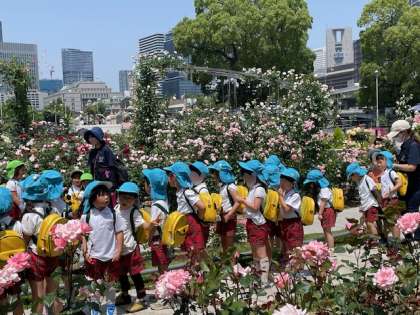 ?ゆり組の先生と子どもたちがじっと見ている視線をたどると、中央公会堂がありました。秋になったらあそこでお歌を歌うんだよ、と先生が子どもたちに話していました。このあとうめ組ゆり組の子どもたちは、広い日陰にリュックサックを置くと並んで歌を歌い始めていました。「バラを見たら歌いたくなった」と言う子どもたちがいたのだそうです。先日の靱公園でのバラ園コンサート出演のことを思い出したのでしょうね。なんと素敵なことでしょう。