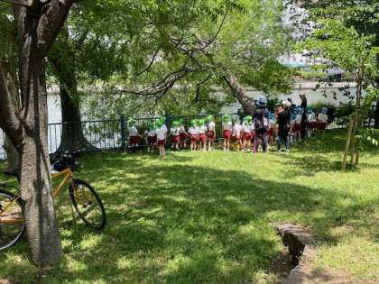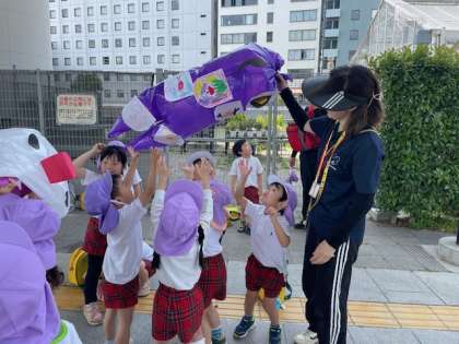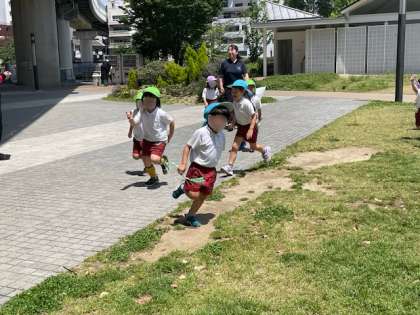 しっぽ取りをしたり、ビニール袋をふくらませて遊んだり、川の流れをながめたり、それぞれ楽しく遊びました。今回は、年少組は幼稚園でお留守番して過ごしましたが、2学期は6クラス全園児で出かけます。