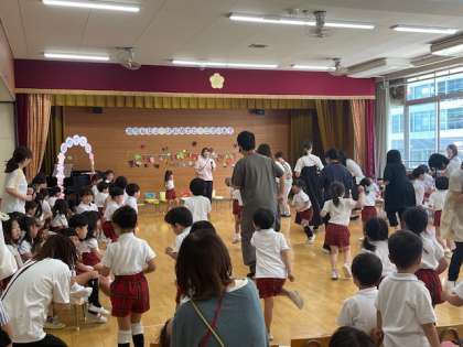 5月の誕生会をしました。5月生まれのお友達の自己紹介を聞いていると、「おめでとう〜」と友達を祝う声が何度も何度も聞かれました。5月生まれさん、おめでとうございます。手作りのプレゼントをもらったり、保護者の皆さんも一緒に体操をしたりしました。「私の誕生会はいつなのかな?」と言っている子どもがいました。毎月行う誕生会、友達を祝う気持ち、祝ってもらう喜びを存分に味わえるように計画して行います。