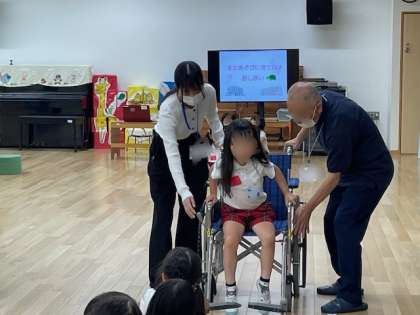 コスモス苑の方が来られました 公開日 2025/06/14 更新日 2025/06/14 うつぼ日記 今年度もコスモス苑の方が年長組の子どもたちに高齢者の生活についてお話をしに来てくださいました。江之子島にある老人ホームコスモス苑での生活の様子などを伝えてくださり、その後は1人ずつ車椅子体験をさせてもらいました。10月には子どもたちがコスモス苑に出向き、お年寄りの方の前で歌を披露し交流する予定です。 いいね(0)