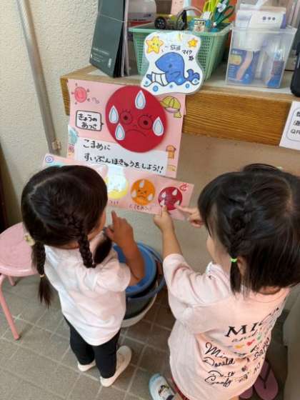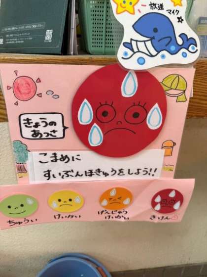 子どもたちにこれからさらに暑くなるので、水分補給をこまめにとること・『危険』が出ているときは室内で遊ぶこと・暑さ指数のお知らせを玄関に貼っていることを伝えました。