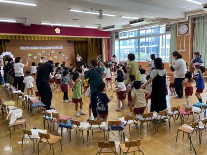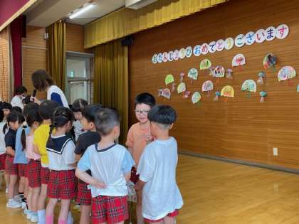 6月の誕生会をしました。今月も「おめでとう〜」の声や、パチパチ…拍手がたくさんで、友達をお祝いする気持ちいっぱいの素敵な時間になりました。「どろぼう猫とねずみ警部」「ムシバイキング体操」もみんなニコニコ笑顔いっぱいとても楽しそうでした。
