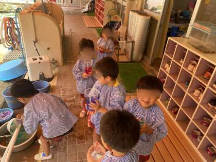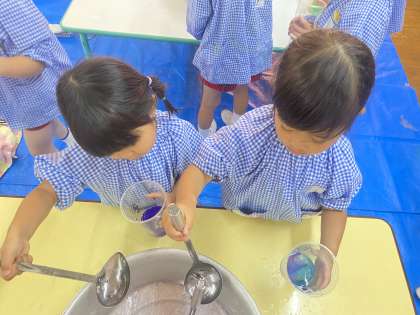 クレープ紙を水に浸し、自分たちで色水をつくって遊びました。色水を混ぜる事で、色が変化することが楽しかったようで夢中になって遊んでいました。。