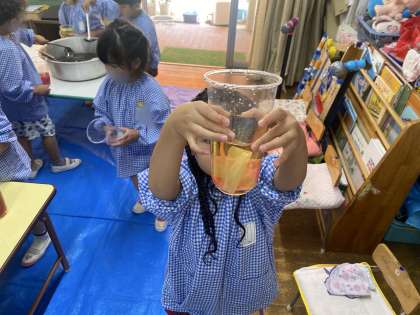 「虹色ジュースつくる」「赤と紫できれいな紫になった」「色んな色の紙入れたらコーラになった」など、組み合わせを楽しんだり、色が変わることに気付いたりして、不思議だな、面白いな、と思って遊びました。
