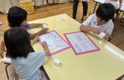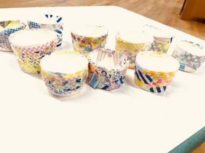 シールを貼るの楽しい! 公開日 2025/07/08 更新日 2025/07/08 うつぼ日記 もも組では、幼稚園140歳のお祝いに、ケーキを作ることになりました。今日は、ケーキを入れるきれいなお皿を作りました。紙コップにマスキングテープをペタペタ貼ったらできあがり。一つ一つ自分で模様を選び、重ねたり白いところが見えないように貼ったり、それぞれ工夫しながら丁寧に貼っていました。 いいね(0)