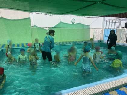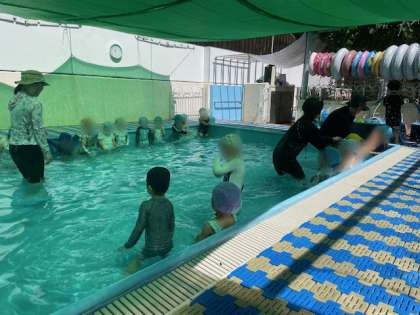 今年度のプール遊びは今日で終了です。子どもたちは水の心地よさを味わっていろいろな遊びを楽しみました。水の中でしゃがんだり歩いたり走ったり浮き輪やビート板で遊んだりして楽しみました。