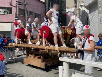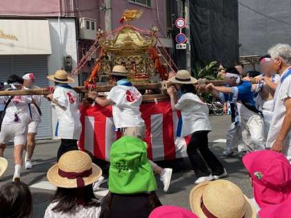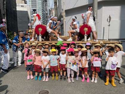 今日は御霊神社の夏祭り、靱枕太鼓の巡業で幼稚園の前を通ってくださいました。預かり保育に参加していた子どもたちは、すぐ近くで繰り広げられる様子に目を輝かせて見入っていました。明後日はPTA育友会主催の夏祭りです。