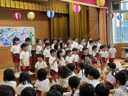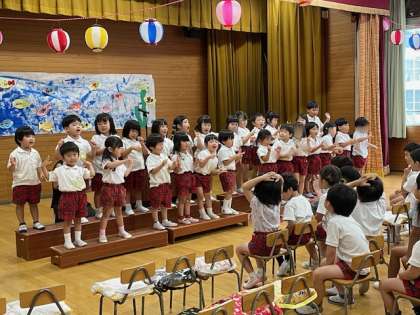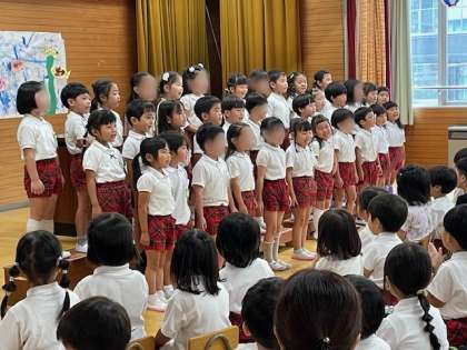 1学期の終業式を行いました。園長から子どもたちに、夏休み中?自分のことは自分でする”?お手伝いをする”?危ないことはしない”という話をしました。そのあと学年ごとに歌を歌いました。3歳児「むしむしジャンケン」4歳児「アイスクリーム」5歳児「おばけなんてないさ」笑顔でのびのびと楽しく歌う子どもたちに成長を感じとてもうれしく思いました。保護者の皆様、園運営にご理解ご協力いただきありがとうございました。