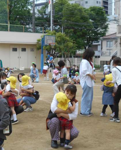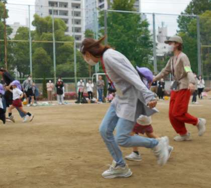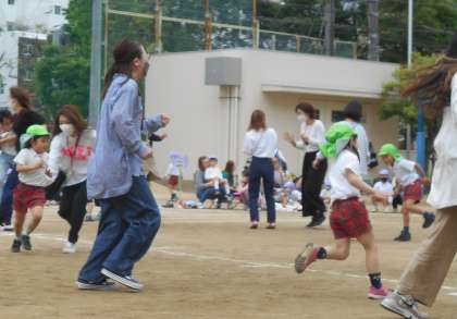 ・4歳児組はおうちの人までタッチをして一緒にかけっこ
