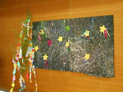 クラスのお願い事を短冊に書き紹介したり、みんなで笹に飾りをつけたりして華やかな笹飾りもできました。