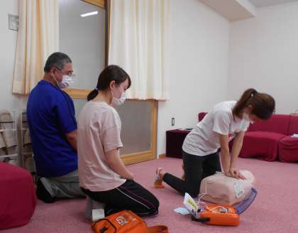 消防署から心肺蘇生訓練用人形をお借りして、AEDを使用した心肺蘇生(胸骨圧迫)の実技訓練を行いました。