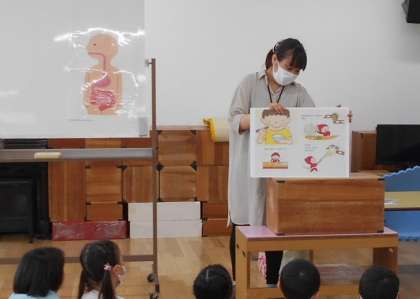 食べ物の通り道の話や『おなかのこびと』の紙芝居を読んでいただき、子どもたちは興味津々で話を聞いたり、質問したりしていました。
