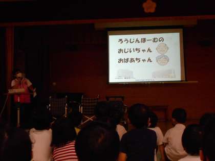 スライドで「老人ホームってどんなところ?」「おじいさん、おばあさんはどんな風に過ごしているの?」などの紹介をしてくださり、子どもたちは興味をもって見ていました。