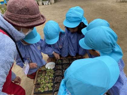 「小さな葉っぱなのに、根っこは長くて強いな!」「いつお花咲くかな…?楽しみやな!」と話し、キンセンカの生長を楽しみにしている子どもたちです!