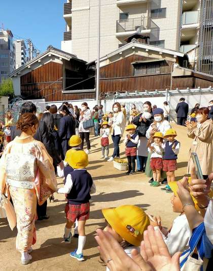 登園時には3・4歳児の子どもたちが園庭で5歳児を迎えてくれました!