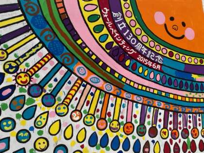 靱幼稚園の外壁に描かれている壁画は、今から8年前の創立130周年年記念のウォールペインティングです。明るい色と楽しいデザインは、元気な子どもたちの雰囲気そのものです。オフィス街にある靱幼稚園の存在を地域に示してくれています。