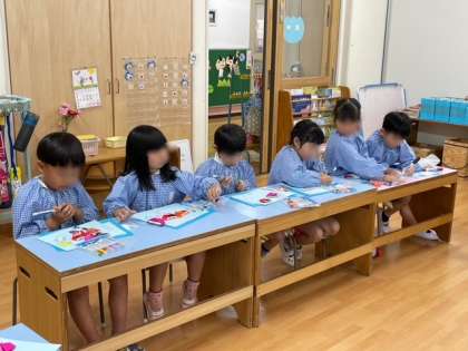 5歳児うめ組では、折り紙でてんとう虫を作りサインペンで絵を描いて折り紙絵本を作っていました。