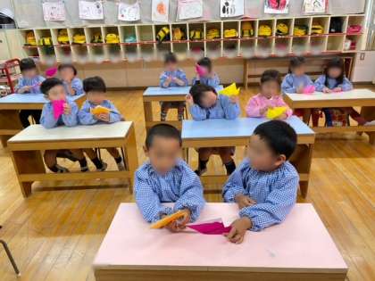 4歳児ばら組では、折り紙でチューリップを作っていました。