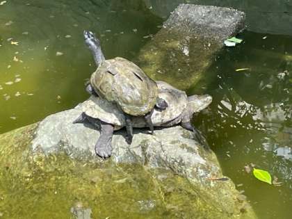 幼稚園の通用門の近くにある池には亀と金魚がいます。小さな生き物に親しみを感じて興味をもってじっと見ている子どもたちがたくさんいます。亀の上に亀が乗っていました。亀は甲羅干しの習性があるので、他に場所が見つからない場合は仲間の亀の甲羅の上に登るのですって…。急に気温があがり