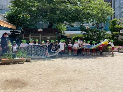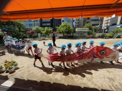 今日は子どもの日の集いをしました。うめぐみゆりぐみさんがこいのぼりをもって登場です!