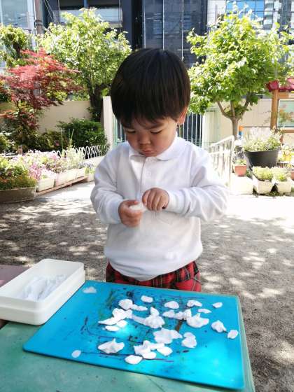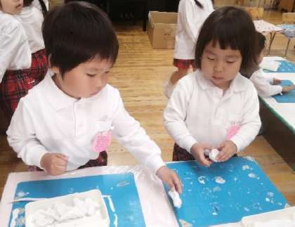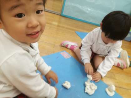 子どもの日の集いのお土産で3歳児は粘土をもらいました。早速幼稚園にもってきて、細くしてみたり…丸めてみたり…いろいろな形をつくっていました。これからいろいろな形をつくるのが楽しみですね!