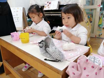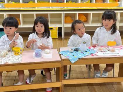 3歳児のおにぎり弁当が始まりました。朝からおにぎりを食べることが楽しみで、リュックからおにぎり袋を出すと「いいにおいでしょ♡」とくんくんしたり、お外で遊んでいても「このあとおにぎりだよね!」と話したり、とってもウキウキしていました。
