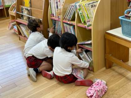 靱幼稚園3階には大きな絵本室があります。今日から絵本貸し出しスタートです。各クラスの子どもたち、3階まであがってきて絵本室にある絵本を見て選んでいました。