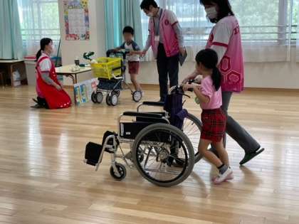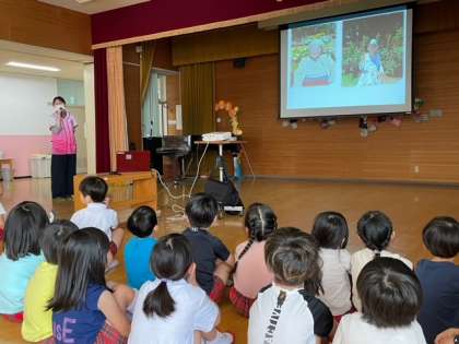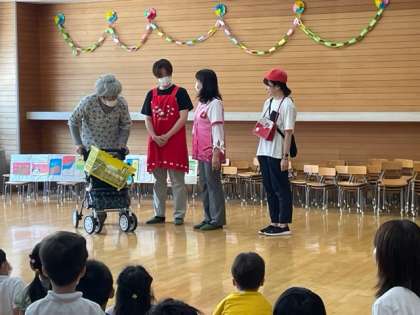 今日は西区江之子島にある特別養護老人ホーム江之子島コスモス苑の職員の方が園に来られました。年長組の子どもたちに、コスモス苑でのお年寄りの方の生活についてお話してくださいました。子どもたちは杖や押し車や車椅子の体験をさせてもらいました。子どもたちのひいおじいちゃんひいおばあちゃんくらいの年になるってどういうことかな?と考える貴重な機会になりました。コスモス苑の職員の皆さんありがとうございました。